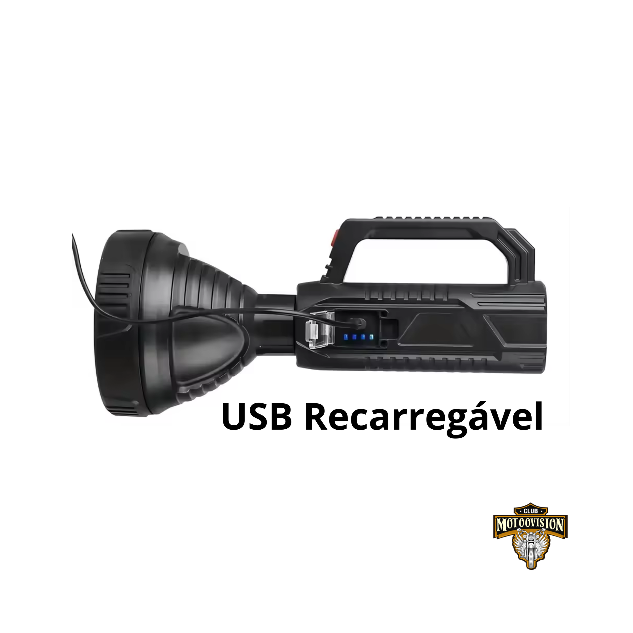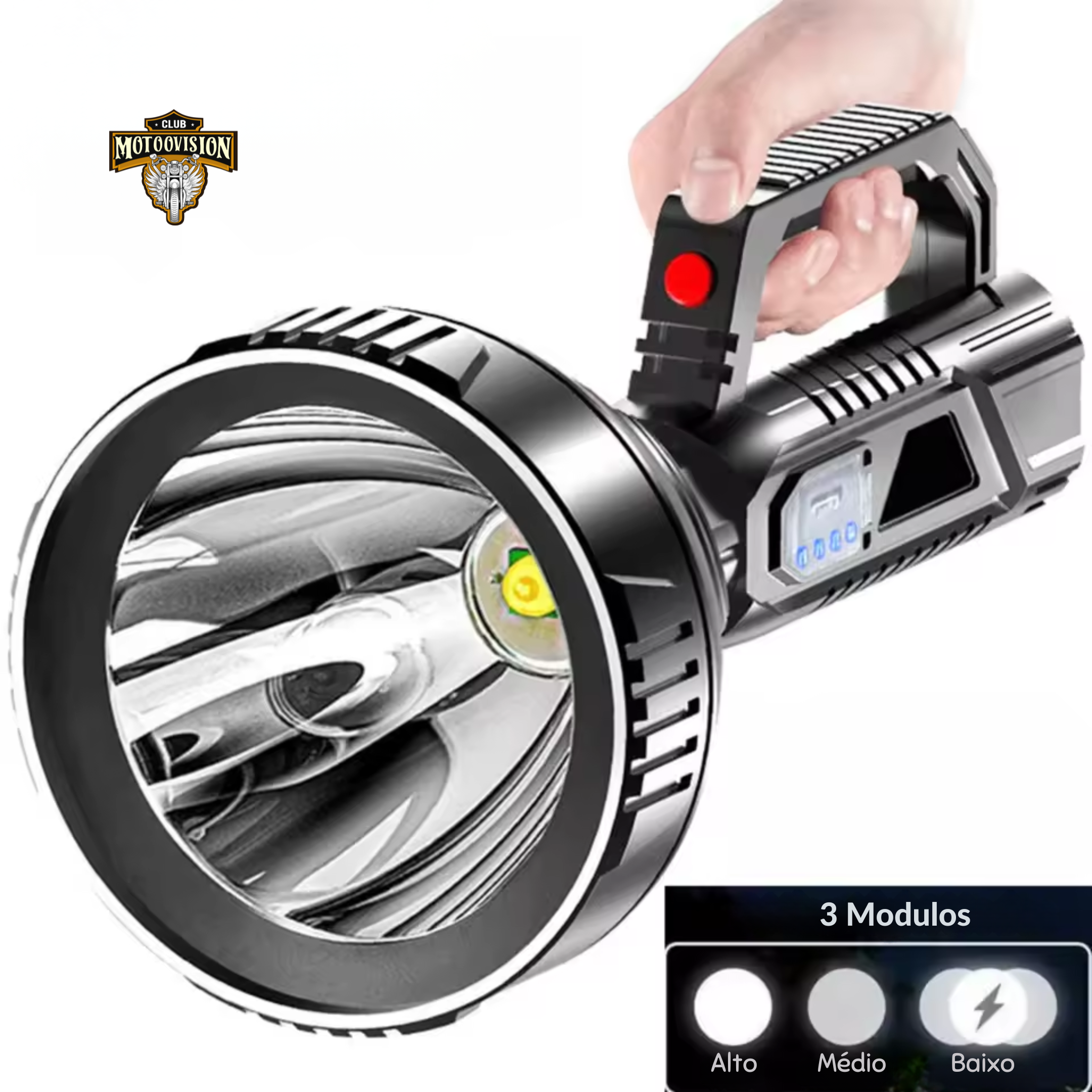 Equipada com LED P100 de alta performance, oferece um feixe de luz extremamente focado e potente, alcançando até 200 a 500 metros, garantindo excelente visibilidade em ambientes escuros.